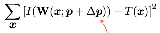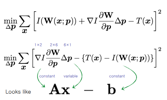 ์์ ๋ณํํ๊ณ ๋๋, ์ฐ๋ฆฌ๊ฐ ๊ตฌํด์ผ ํ๋ โณp๋ฅผ ๊ตฌํ๋ ๊ฒ์ด ์ ํ์ ๋ฌธ์ ๋ก ๋ฐ๋์๋ค! ๊ทธ ๊ณผ์ ์์ ์๊ธด โฝI(Image Gradient)๊ฐ ์๊ฒผ๋ค๋ ์ , ๊ทธ ๋ค์ ๋์ค๋ W๋ฅผ p๋ก ๋ฏธ๋ถํ ํ๋ ฌ(Jacobian)์ด ์๊ฒผ๋ค๋ ์ ๋ง ํ์ธํด ์ค๋ค๋ฉด, ์ฐ๋ฆฌ๋ ํด๋น ๋ฌธ์ ๋ฅผ ์ต์์์นํด๋ฅผ ํตํด ๊ตฌํ ์ ์์ ๊ฒ์ด๋ค! ๋์ด ๋ณด์ธ๋ค.