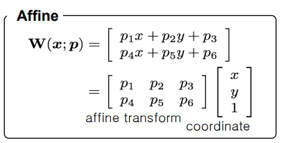 W(x;p)๋ ์ ๋ ฅ ์ด๋ฏธ์ง๋ฅผ ๋ณํํด ๋น๊ตํด๋ณด๊ฒ ๋ค๋ ๊ฒ์ด๋ค. ์ฌ๊ธฐ์ p๋ W์ ๋งค๊ฐ๋ณ์๋ก '๋ด๊ฐ ์ด๋ป๊ฒ ์ด ์ด๋ฏธ์ง๋ฅผ ๋ณํํด์ผ ๊ฐ์ง๊ณ ์๋ patch์ ์ ์ฌํ ๋ชจ์์ด ๋ ๊ฒ์ธ๊ฐ'์ ๋ํ ๊ฐ์ด๋ค. W(x; p)๋ฅผ ํํํ๋ฉด ๋ค์๊ณผ ๊ฐ๋ค. x, y๊ฐ์ ๋ฃ์์ ๋, ๋งค๊ฐ๋ณ์ p(p1, p2, p3...)์ ๊ณ์ฐํ ๊ฒฐ๊ณผ (2×1)์ ์ขํ๊ฐ ๋์จ๋ค.