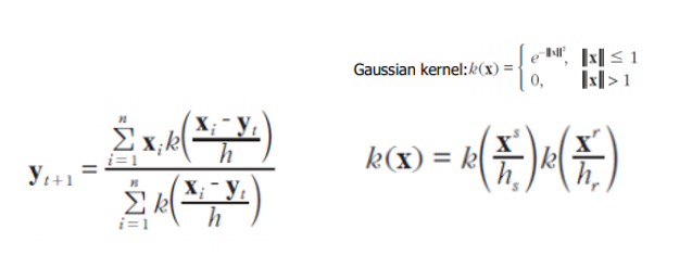 ์ผ์ชฝ ์์์ ๋ณด๋ฉด, ๋ถ๋ชจ์๋ ์ด๋ค weight ๊ฐ์ ํฉ, ๋ถ์์๋ weight์ ํฝ์ ๊ฐ์ ๊ณฑํ ํํ๋ก ์ผ์ข ์ ํ๊ท ์ ๋ด๊ณ ์์์ ์ ์ ์๋ค. ์ด ๋, k()๋ ๊ฐ์ฐ์์ ์ปค๋์ด๋ฉฐ, h์ ๊ฐ์๋ ์ด์ ์ ์ ํ๋ hr, hs์ ๊ฐ์ด ๋ค์ด๊ฐ๋ค. RGB ๋๋ฉ์ธ์ ๊ณ ๋ คํ ๋ hr, xy ๋๋ฉ์ธ์ ๊ณ ๋ คํ ๋ hs๋ฅผ ํ์ฉํ๋ค. ์ด๋ ๊ฒ ์ ์ ์ ๋ฐ์ดํธํ๊ณ ๋๋ฉด ํด๋น ๊ณผ์ ์ ๊ณ์ ๋ฐ๋ณตํ๋ค. ์ด ๊ณผ์ ์ด ๋ฐ๋ณต๋๋ฉด ๋ค์ ๊ทธ๋ฆผ์ฒ๋ผ ํฝ์ ๋ค์ด ๋ชจ์ด๋ ์ง์ (basin)๋ค์ด ์๊ฒจ๋๋ค.