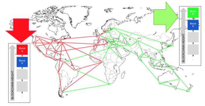 ๊ทธ๋ ๋ค๋ฉด ๋ง์ฝ์ ์ฑ๊ตด์ ์ A์ B๊ฐ ๋์์ ๋ธ๋ก์ ์ฑ๊ตดํ๋ค๋ฉด ์ด๋ป๊ฒ ๋ ๊น์? A ์ฃผ๋ณ์ ๋ ธ๋, ์ฆ A์ ๋ธ๋ก์ ๋ฐ์ ์ฌ๋๋ค์ B์ ๋ธ๋ก์ ํ ๋ฐ ๋ฆ์๋ค๋ฉฐ ์ต์ ๋ธ๋ก์ผ๋ก ์ธ์ ํ์ง ์์ ๊ฒ์ ๋๋ค. B ์ฃผ๋ณ์ ๋ ธ๋, ์ฆ B์ ๋ธ๋ก์ ๋ฐ์ ์ฌ๋๋ค์ A์ ๋ธ๋ก์ ํ ๋ฐ ๋ฆ์๋ค๋ฉฐ ์ต์ ๋ธ๋ก์ผ๋ก ์ธ์ ํ์ง ์์ ๊ฒ์ ๋๋ค. ์ ๊ทธ๋ฆผ๊ณผ ๊ฐ์ด ๋ ธ๋๋ค์ด ๊ฐ์ ๋ค๋ฅธ ์ฅ๋ถ๋ฅผ ๊ฐ๊ฒ ๋๋ฉฐ ์ด๋ฅผ '๋ถ๊ธฐ'๋ผ๊ณ ํฉ๋๋ค. ๋ธ๋ก์ฒด์ธ์ ๋ชจ๋ ์ฌ๋๋ค์ด ๊ฐ์ ์ฅ๋ถ๋ฅผ ๊ฐ์ง๊ณ ์๋ ๊ฒ์ด ์ค์ํ๊ธฐ ๋๋ฌธ์ ์ด๋ฅผ ํด๊ฒฐํ ๋ฐฉ๋ฒ ๋ํ ๋ง๋ จ๋์ด ์์ต๋๋ค.