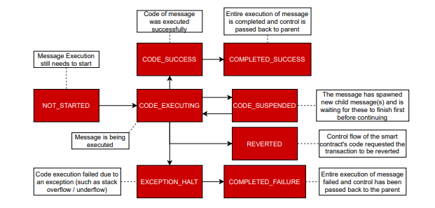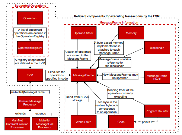 Besu์์์ ํธ๋์ญ์ ์ ๋ฉ์์ง ์ฝ์ด๊ฑฐ๋ ์ปจํธ๋ ์์ฑ ํธ๋์ญ์ ์ด๋ค. ์ฐ๋ฆฌ๋ ์ด ๋ ๊ฐ์ง ํธ๋์ญ์ ์ด ๊ฐ์ ์ธํฐํ์ด์ค๋ฅผ ํตํด ๊ตฌํ๋จ์ ์ ์ ์์๋ค. ์ด ๋๊ฐ์ง ํธ๋์ญ์ ์ด ๋ฉ์ธ์ง, ์ฆ ์ฅ๋ถ์ ์์ฒญํ ๋ณํ๋ผ๋ ๊ฒฐ๊ณผ๋ฅผ ๊ฐ์ ธ์จ๋ค. ๋ฉ์ธ์ง๋ค์ Besu์์ MessageFrame์ ํํ๋ก ํํ๋๋๋ฐ, MessageFrame์ "๋ฉ์ธ์ง์ ๊ด๋ จ๋ ๋ชจ๋ state์ ์ปจํ ์ด๋ ๊ฐ์ฒด"์ด๋ค. ๊ด์ต์ ์ผ๋ก, ์ด๊ฒ์ MessageFrame์ global state(WorldsState, blockchain), ์คํ ์ํคํ ์ณ(program counter, memory, stack) ๋ฑ ์ฌ๋ฌ ๊ฐ(44)์ private ํญ๋ชฉ์ ํฌํจํ๊ณ ์์์ ์๋ฏธํ๋ค. Besu์ EVM ๊ตฌํ ์ ๋ถ๋ฅผ ์ค๋ช ํ๋ ๊ฒ์ ๋๋ฌด ๊ธฐ์ ์ ์ด๋ค. ๊ทธ๋ฌ๋ฏ๋ก ๊ทธ๋ฆผ 3.16, ๊ทธ๋ฆผ 3.17์ ์์ฝ๋ ๊ทธ๋ฆผ์ ์ฐธ๊ณ ํ๋ฉด ์ข์ ๊ฒ์ด๋ค.