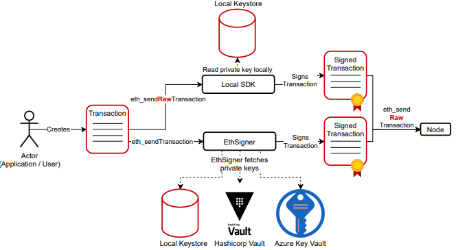 sendRawTransaction ๋ฉ์๋๋ฅผ ์ฌ์ฉํ๋ ๊ฒ์ ํธ๋์ญ์ ์ ์์ฑํ ๋๋ ๋ชจ๋๊ฐ ๊ฐ์ธ ํค๋ฅผ ๊ฐ์ง๊ณ ์๋ช ํด์ผ ํ๋ฏ๋ก ์ดํ๋ฆฌ์ผ์ด์ ์๊ฒ ๋๋ฌด ๋ง์ ๋ถ๋ด์ ์ง๊ฒํ๋ ๊ฒ์ผ ์๋ ์๋ค. ๊ทธ๋ฌ๋ฏ๋ก Besu๋ EthSigner๋ผ๋ ์ํํธ์จ์ด ์ปดํฌ๋ํธ๋ฅผ ์ฌ์ฉํ ์ ์๋ค. ๊ธฐ๋ณธ์ ์ผ๋ก, EthSigner๋ eth_sendTransaction ๋ฉ์๋๋ฅผ ๊ตฌํํ๋ฉฐ, ๋ ธ๋ ์์ ๋ถ์ด ํ๋ก์ ์ปดํฌ๋ํธ์ ์ญํ ์ ํ๋ค. EthSigner๋ฅผ ํตํด actor๋ ๊ฐ์ธ ํค์ ๋ํด ์๊ณ , ํธ๋์ญ์ ์ ์์ฑํ๋ ๊ฒ์ ๋ํ ๋ถ๋ด ์์ด eth_sendTransaction ๋ฉ์๋๋ฅผ ์ฌ์ฉํ ์ ์๋ค. EthSigner๋ ๋ฌด์๋ช ํธ๋์ญ์ ์ ๋ฐ์ผ๋ฉด, ๊ทธ๊ฒ์ ์๋ช ํ๊ณ ๋ ธ๋์ eth_sendRawTransaction์ผ๋ก ๋ณด๋ผ ๊ฒ์ด๋ค. ๊ณต๊ฐ ํค/๊ฐ์ธ ํค ์ ์ญ์ EthSigner ์ธ์คํด์ค์ ํ์ผ ์์คํ ์ ๋ก์ปฌ๋ก ์ ์ฅํ๊ฑฐ๋, Hashicorp Vault์ ์ ์ฅํ๊ฑฐ๋, Key Vault of Microsoft Azure์ ์ ์ฅํ ์ ์๋ค. ๊ทธ๋ฆผ 3.19๋ ๋ ธ๋์ ํธ๋์ญ์ ์ ๋ณด๋ด๋ ๊ณผ์ ์ ์ค๋ช ํ๋ค.