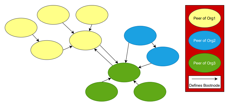 ๋ง์ฝ ํผ์ด์ ์ต์ ์ซ์(ํฉ์ ์๊ณ ๋ฆฌ์ฆ์ ๋ฐ๋ผ ๋ค๋ฅด๋ค)๋ฅผ ์ฐพ์ผ๋ฉด, ๋คํธ์ํฌ๊ฐ ๋์๋๊ธฐ ์์ํ๋ค. ์ผ๋ง๋ ๋ค์ํ ์กฐ์ง๋ค์ด ํผ์ด์ ๊ด์ ์ผ๋ก ๋คํธ์ํฌ๋ฅผ ํตํด ํ์ ํ ์ ์๋์ง ๊ทธ๋ฆผ 3.12์์ ๋ณด์ฌ์ค๋ค. ์กฐ์ง๋ค์ ๊ตฌ๋ถ์ด ์ ๋๋ผ๊ณ ์์น ํ ๊ฒ์ด์ง, ๊ธฐ์ ์ ์ผ๋ก ๋ค๋ฆ์ ๋ํ๋ด์ง ์๋๋ค. ์ด์ ์๋ ๋งํ์ง๋ง Besu์๋ ์กฐ์ง์ด๋ผ๋ ์ปจ์ ์์ฒด๊ฐ ์๋ค. ํ์ง๋ง ๊ธฐ๊ด์์ ํ๋์ ๋ ธ๋๋ฅผ ๋ฉ์ธ ๋ถํธ ๋ ธ๋๋ก ์ฌ์ฉํ๋ฉด์, ๋ค๋ฅธ ๊ธฐ๊ด์ ๋คํธ์ํฌ์ ์ฐ๊ฒฐํ๋ ๋ฐฉ๋ฒ๋ ์ฌ์ฉํ ์๊ฐ ์๋ค. ๊ทธ๋ฆผ 3.12์์ ์ดOrg3์ ๊ฒฝ์ฐ๊ฐ ๊ทธ๋ฌํ๋ค. ์ด ๋ค์ด์ด๊ทธ๋จ์ ํตํด์, ์กฐ์ง์ด ๊ทธ๋ค์ bootnode๋ฅผ ์ ํ๋ ๋ฐ์ ์์ด, ๊ต์ฅํ ์ ์ฐํ๋ฉฐ ์ฌ๋ฌ๊ฐ์ ์กฐ์ง์ ๊ฑธ์ณ ์ฌ๋ฌ๊ฐ์ ๋ ธ๋๋ฅผ ์์ ์ bootnode๋ก ์ค์ ํ ์ ์์์ ํ์ธํ ์ ์๋ค. ์ฌ์ค ๋คํธ์ํฌ์ ์ฐ๊ฒฐ๋ ํ๋์ ๋ ธ๋์๋ง ์ฐ๊ฒฐ๋์ด ์์ด๋, peer discovery๋ฅผ ํตํด ๋คํธ์ํฌ ์์ ๋ชจ๋ ๋ ธ๋์ ํต์ ํ ์ ์๋ค.