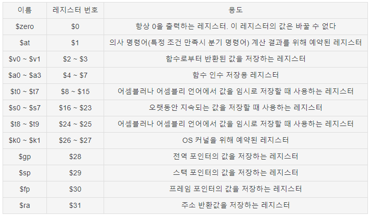 ์ด๋ ๊ฒ ์ฐ์ฐ์ ํ ๋ ํผ์ฐ์ฐ์๋ ๋ ์ง์คํฐ๊ฐ ๋์ด์ผํ๋๋ฐ, ์ด๊ฒ ๋ฌด์จ ๋ง์ด๋. ๋ ์ง์คํฐ๋ ์ผ๋ฐ์ ์ผ๋ก ๋น ๋ฅธ ์ฐ์ฐ์ ์ํด ์ฌ์ฉํ๋ ๋ฉ๋ชจ๋ฆฌ์ด๊ณ , ๋ณดํต ํ์ฌ ๊ณ์ฐ์ ์ํ์ค์ธ ๊ฐ์ ์ ์ฅํ๋๋ฐ์ ์ฌ์ฉ๋๋ค. MIPS๋ 32bit ํฌ๊ธฐ์ ๋ ์ง์คํฐ๊ฐ 0๋ฒ-31๋ฒ๊น์ง ์ด 32๊ฐ๊ฐ ์กด์ฌํ๋ค. ์ด ๋ ์ด 32bit ๋ฐ์ดํฐ๋ 'word'๋ผ ํ๋ค. ์ด์